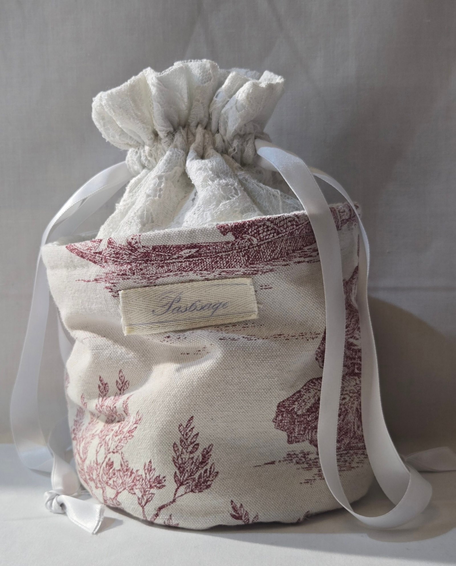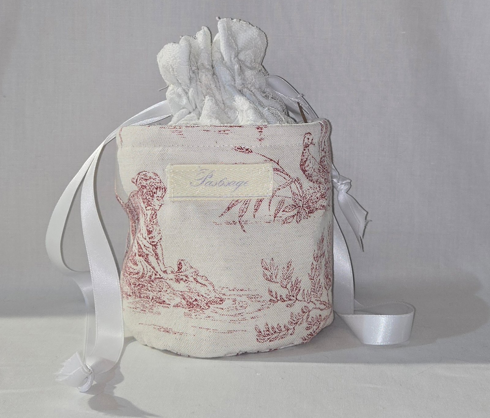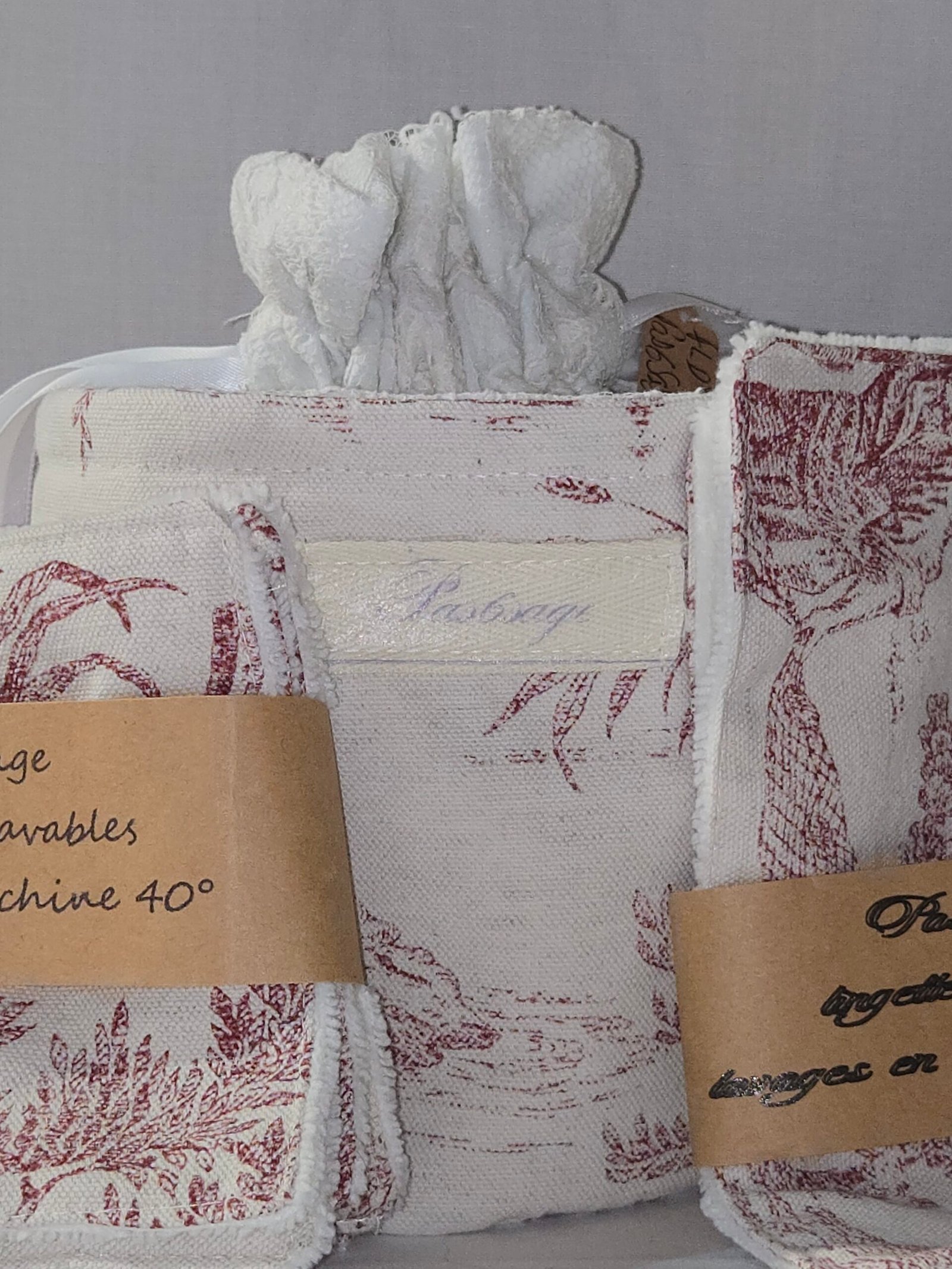 Confectionné à partir de tissus upcyclés soigneusement sélectionnés, ce set associe la délicatesse intemporelle de la toile de Jouy à la douceur naturelle de l’éponge de bambou , la dentelle vient souligner son allure élégante et délicate.