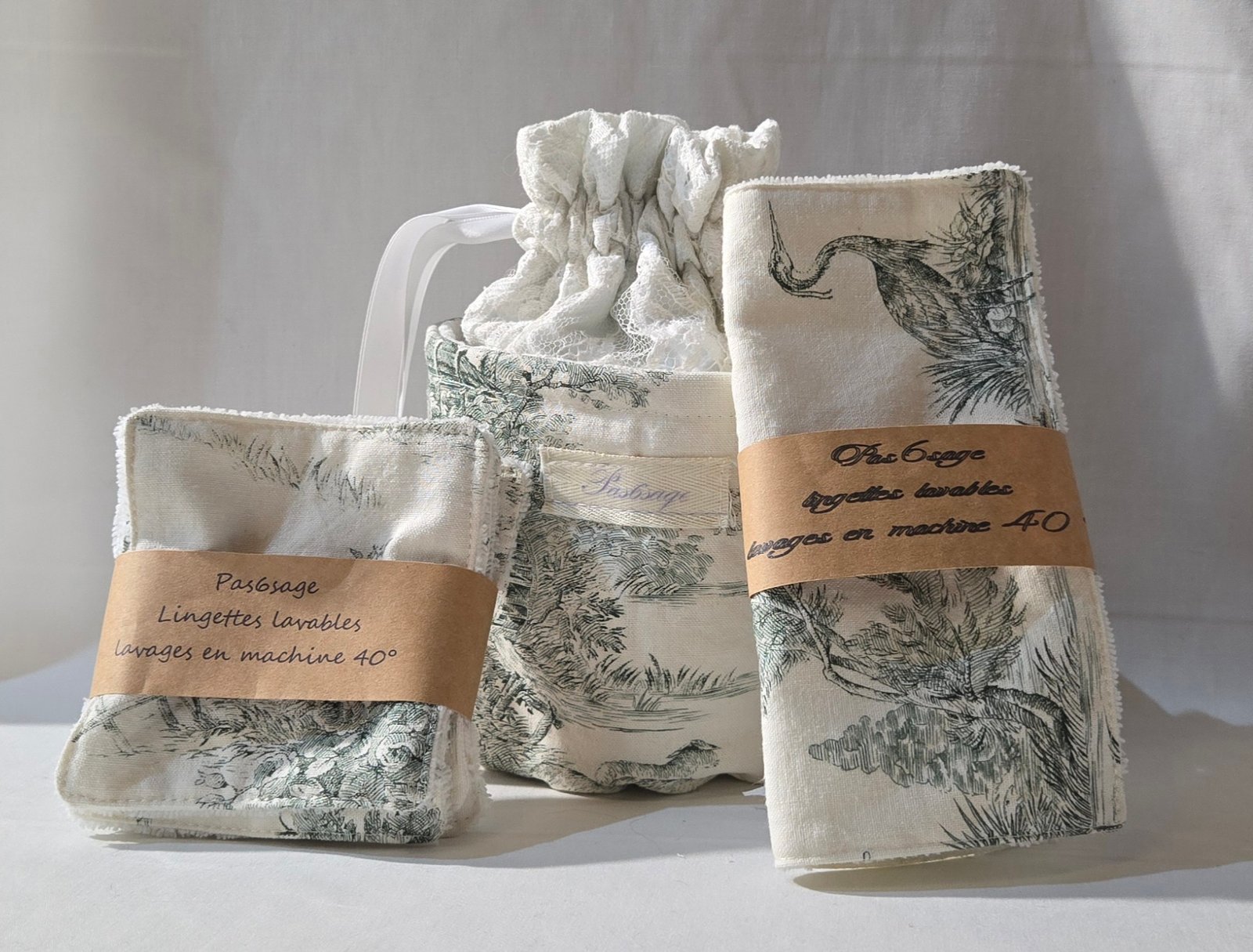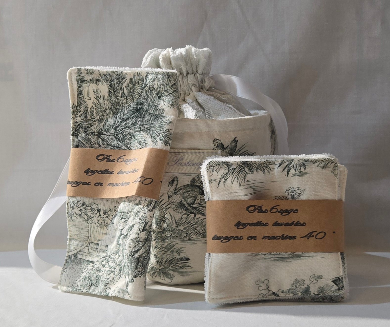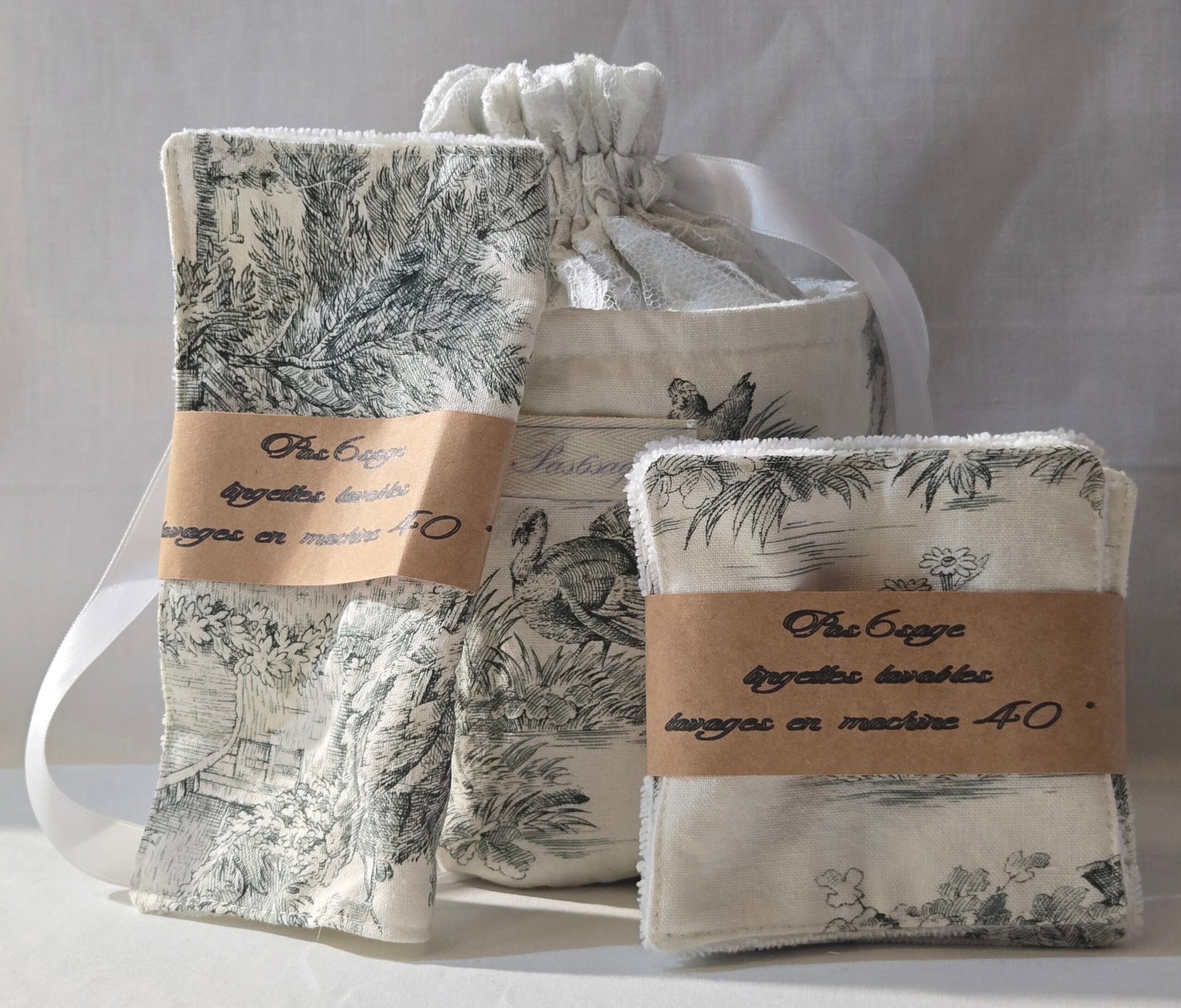 Confectionné à partir de tissus upcyclés soigneusement sélectionnés, ce set associe la délicatesse intemporelle de la toile de Jouy à la douceur naturelle de l’éponge de bambou , la dentelle vient souligner son allure élégante et délicate.