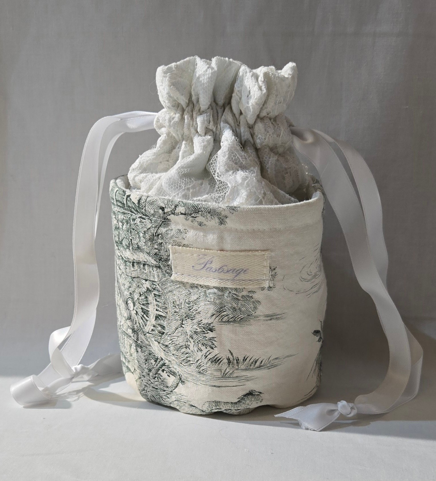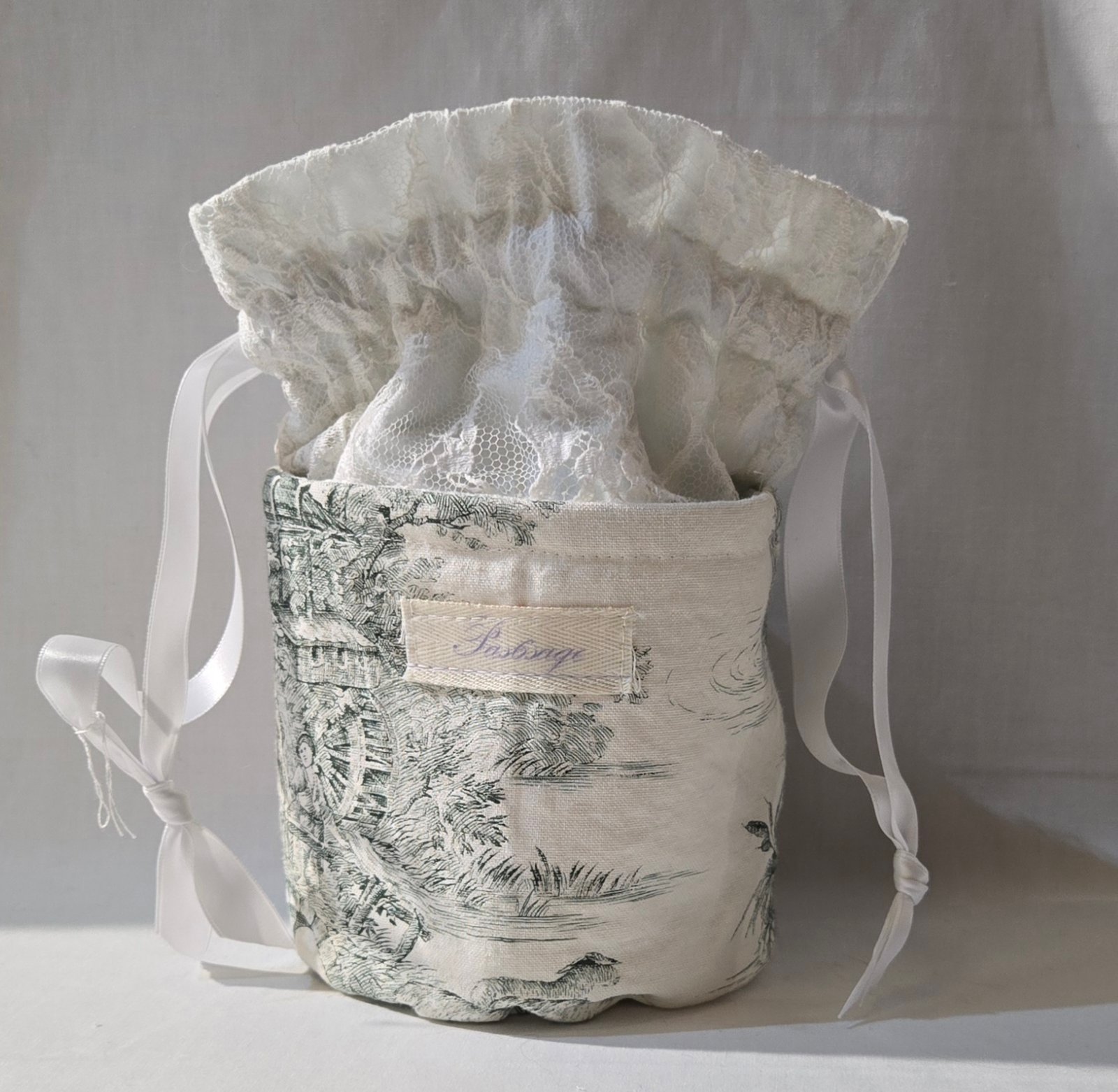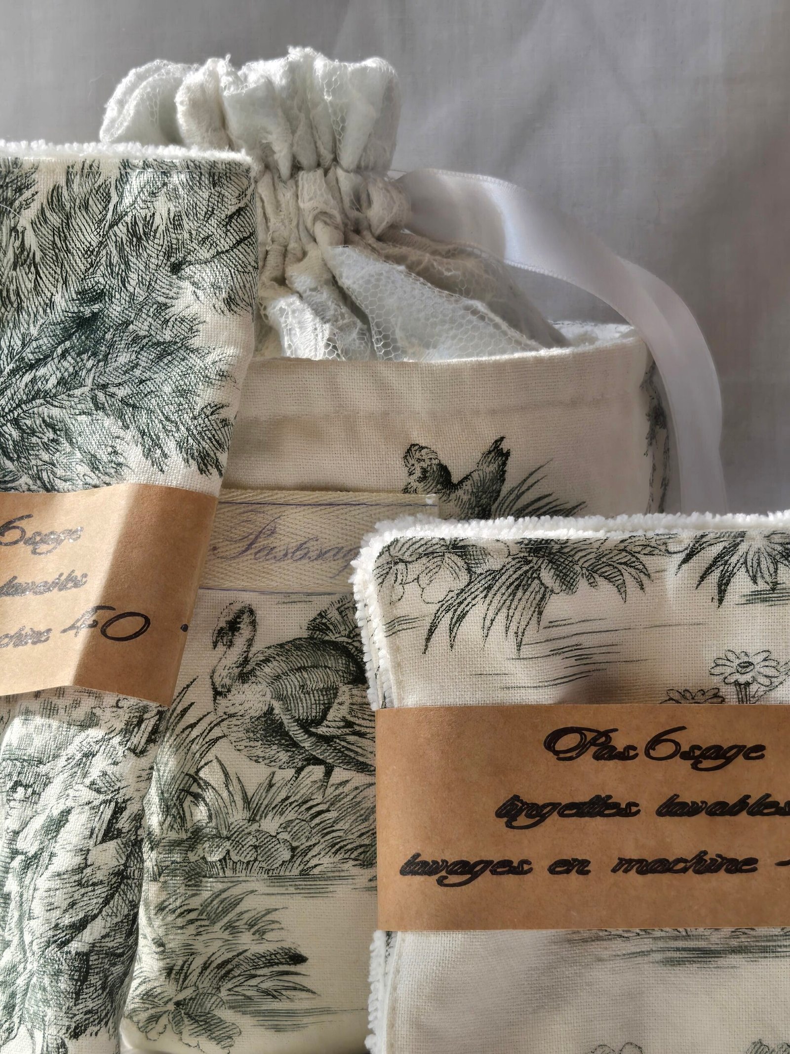 Confectionné à partir de tissus upcyclés soigneusement sélectionnés, ce set associe la délicatesse intemporelle de la toile de Jouy à la douceur naturelle de l’éponge de bambou , la dentelle vient souligner son allure élégante et délicate.